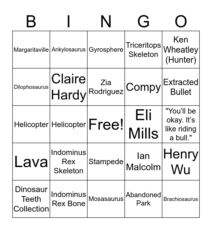 This bingo card has a free space and 52 words: Baryonyx, Brachiosaurus, Indoraptor, Mosasaurus, Indominus Rex Skeleton, Stygimoloch ( Lil' Headbutter), Ankylosaurus, Velociraptor, Dilophosaurus, Owen Grady, Claire Hardy, Maisie Lockwood, Henry Wu, Ian Malcolm, Sir Benjamin Lockwood, Franklin Webb, Zia Rodriguez, Eli Mills, Gunnar Eversol (Auctioner), Ken Wheatley (Hunter), Helicopter, Abandoned Park, Margaritaville, Compy, Volcano, Lockwood's Staff, Gallimimus, Jurassic Park Jeep, Extracted Bullet, Bag of T-Rex Blood, Baby Velociraptors, Triceritops Skeleton, Surfers, Lion, "Welcome...to Jurassic World.", Gyrosphere, Indominus Rex Bone, "If I don't make it back... remember that you're the one that made me come here.", "Do you remember the first time you saw a dinosaur? First time you see them, it's like... a miracle", "I rode a motorcycle through the jungle with a pack of raptors.", "We'renot compatible", "You’ll be okay. It’s like riding a bull.", Lava, Secret Labratory, Stampede, Map of Island, Sneaky Indoraptor Attack, Helicopter, Boat, Bug Spray, Dinosaur Teeth Collection and Jurassic Park Model.