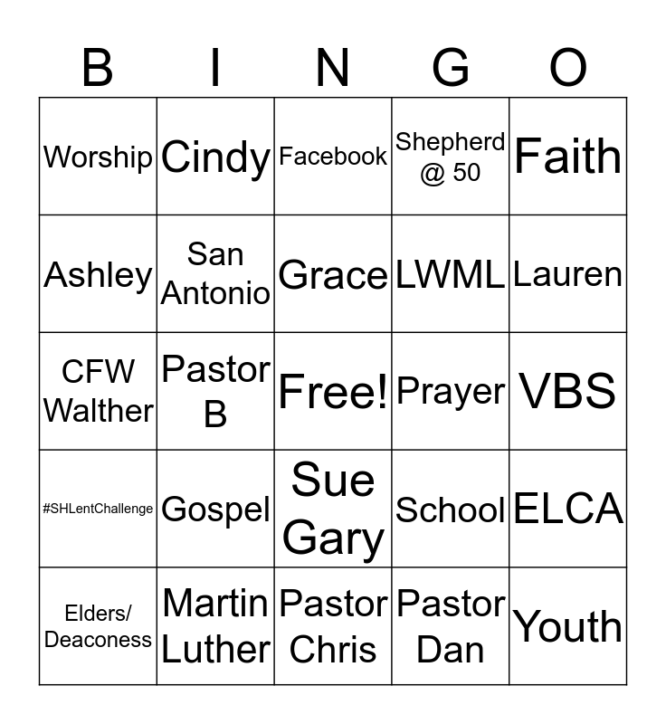 This bingo card has a free space and 26 words: Sue Gary, Pastor Dan, Grace, Martin Luther, Faith, Worship, Ashley, Cindy, VBS, School, LWML, CFW Walther, ELCA, Elders/ Deaconess, Pastor B, Chapel, Shepherd @ 50, #SHLentChallenge, Facebook, Youth, Lauren, Pastor Chris, Prayer, Gospel, San Antonio and Medical center.