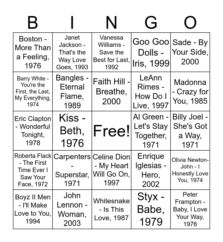 This bingo card has a free space and 86 words: Whitney Houston - I Will Always Love You, 1992, Elvis Presley - Love Me Tender, 1956, Celine Dion - My Heart Will Go On, 1997, Journey - Open Arms, 1982, The Righteous Brothers - Unchained Melody, 1966, Lionel Richie & Diana Ross - Endless Love, 1981, Elton John - Your Song, 1970, The Jackson 5 - I'll Be There, 1970, Aerosmith - I Don't Want to Miss a Thing, 1998, Etta James - At Last, 1961, Bee Gees - How Deep Is Your Love, 1977, Sinead O'Connor - Nothing Compares 2 U, 1990, Olivia Newton-John - I Honestly Love You, 1974, Billy Joel - She's Got a Way, 1971, Frank Sinatra - Fly Me to the Moon, 1964, Faith Hill - Breathe, 2000, Peter Gabriel - In Your Eyes, 1986, Chicago - If You Leave Me Now, 1976, Sonny & Cher - I Got U Babe, 1965, John Travolta & Olivia Newton-John - You're the One That I Want, 1978, Barbra Streisand & Neil Diamond - You Don't Bring Me Flowers, 1978, Natalie Cole & Nat King Cole - Unforgettable, 1991, Eric Clapton - Wonderful Tonight, 1978, Joe Cocker - You Are So Beautiful, 1975, Styx - Babe, 1979, Rod Stewart - You're in My Heart (The Final Acclaim), 1978, Marvin Gaye - Let's Get It On, 1973, Willie Nelson - Always on My Mind, 1982, Celine Dion - Because You Loved Me, 1996, Stevie Wonder - You Are the Sunshine of My Life, 1973, John Lennon - Woman, 2003, Bryan Adams - (Everything I Do) I Do It for You, 1991, REO Speedwagon - Keep on Loving You, 1980, Carpenters - Superstar, 1971, Barry White - You're the First, the Last, My Everything, 1974, No Doubt - Don't Speak, 1996, Madonna - Crazy for You, 1985, Bon Jovi - I'll Be There for You, 1988, Shania Twain - You're Still the One, 2004, Kiss - Beth, 1976, Meat Loaf - I'd Do Anything for Love, 1993, Extreme - More Than Words, 1991, Toni Braxton - Un-Break My Heart, 1996, Al Green - Let's Stay Together, 1971, Prince - I Would Die 4 U, 1984, Sade - By Your Side, 2000, Atlantic Starr - Always, 1987, Janet Jackson - That's the Way Love Goes, 1993, Def Leppard - Love Bites, 1988, Barry Manilow - Mandy, 1975, Alicia Keys - Fallin', 2001, The Pretenders - I'll Stand by You, 1994, Roberta Flack - The First Time Ever I Saw Your Face, 1972, Foreigner - Waiting for a Girl Like You, 1981, The Emotions - Best of My Love, 1977, Journey - Faithfully, 1983, Commodores - Three Times a Lady, 1978, LeAnn Rimes - How Do I Live, 1997, Goo Goo Dolls - Iris, 1999, Bangles - Eternal Flame, 1989, Boston - More Than a Feeling, 1976, INXS - Never Tear Us Apart, 1988, The Partridge Family - I Think I Love You, 1970, Led Zeppelin - Whole Lotta Love, 1969, Captain and Tennille - Love Will Keep Us Together, 1975, Vanessa Williams - Save the Best for Last, 1992, Chaka Khan - I Feel for You, 1984, Peter Frampton - Baby, I Love Your Way, 1976, Donna Summer - Love to Love You Baby, 1975, Lisa Lisa & Cult Jam - All Cried Out,, Guns N' Roses -Sweet Child O' Mine, 1988, Chris Isaak - Wicked Game, 1991, Boyz II Men - I'll Make Love to You, 1994, Cyndi Lauper - Time After Time, 1984, Wham! - Careless Whisper, 1984, Bruce Springsteen - Secret Garden, 1997, Whitesnake - Is This Love, 1987, Dido - Thank You, 1999, Brian McKnight - Back at One, 1999, Elvis Costello - Alison, 1978, Pat Benatar - We Belong, 1985, *NSYNC - This I Promise You, 2000, Andy Gibb - I Just Want to Be Your Everything, 1977, LL Cool J - I Need Love, 1987, Enrique Iglesias - Hero, 2002 and Poison - Every Rose Has It's Thorn, 1988.