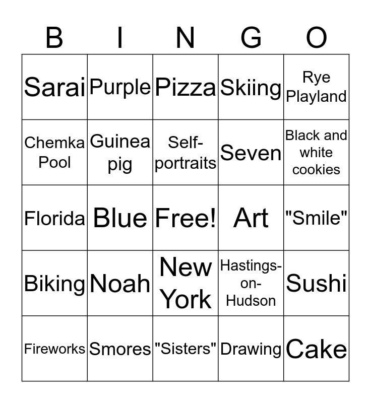 This bingo card has a free space and 24 words: Noah, Smores, Self-portraits, Fireworks, Rye Playland, Sarai, Chemka Pool, Purple, Art, New York, Seven, Florida, Hastings-on-Hudson, Sushi, Guinea pig, Drawing, "Smile", Pizza, Black and white cookies, Blue, Cake, Biking, Skiing and "Sisters".