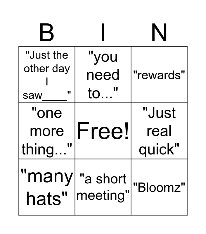 This bingo card has a free space and 8 words: "Just real quick", "rewards", "you need to...", "many hats", "Just the other day I saw____", "Bloomz", "one more thing..." and "a short meeting".