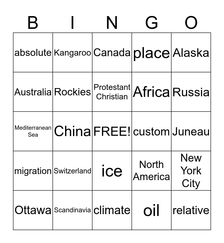 This bingo card has a free space and 24 words: Switzerland, Scandinavia, Protestant Christian, Ottawa, Alaska, absolute, Australia, Kangaroo, custom, ice, Africa, Mediterranean Sea, North America, New York City, Rockies, oil, Juneau, Canada, Russia, China, relative, migration, place and climate.