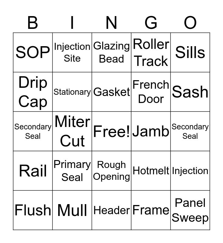 This bingo card has a free space and 24 words: Primary Seal, Mull, Gasket, Flush, Sills, SOP, Drip Cap, Injection Site, Jamb, Rough Opening, French Door, Secondary Seal, Hotmelt, Injection, Stationary, Frame, Secondary Seal, Glazing Bead, Sash, Miter Cut, Panel Sweep, Rail, Roller Track and Header.