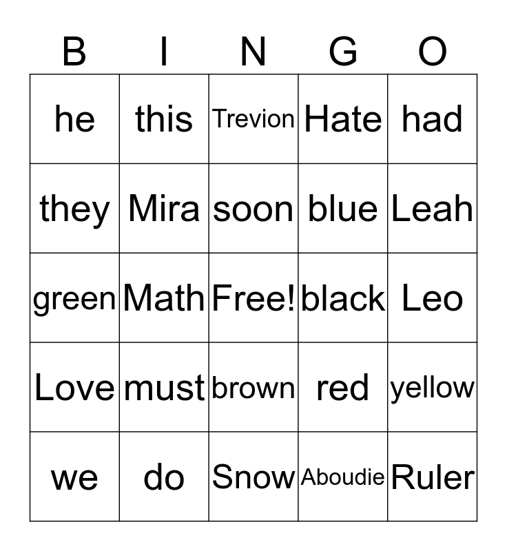 This bingo card has a free space and 24 words: must, do, soon, we, had, he, they, this, black, brown, blue, green, red, yellow, Mira, Aboudie, Leo, Trevion, Leah, Math, Ruler, Love, Hate and Snow.