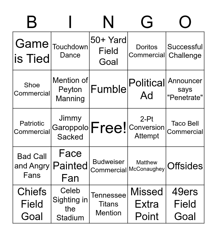 This bingo card has a free space and 43 words: 49ers Touchdown, 49ers Field Goal, Chiefs Touchdown, Chiefs Field Goal, Missed Field Goal, Missed Extra Point, 50+ Yard Field Goal, Interception, Successful Challenge, Celeb Sighting in the Stadium, Doritos Commercial, 2-Pt Conversion Attempt, Budweiser Commercial, Face Painted Fan, Surprise Halftime Guest, Tennessee Titans Mention, Shot of Miami, Patriotic Commercial, 4th Down Conversion, Announcer says "Penetrate", Touchdown Dance, Commercial with Puppies, Roger Goodell Mentioned, Game is Tied, Camera Guy Hit with Football, Taco Bell Commercial, Coke Commercial, Pepsi Commercial, Matthew McConaughey, Bad Call and Angry Fans, Call Reversed, Offsides, Talking Animal Commercial, Jimmy Garoppolo Sacked, Patrick Mahomes Sacked, Face Mask Penalty, Holding Call, Fumble, Shoe Commercial, Political Ad, Mention of Uniforms/Team Colors, Mention of Peyton Manning and Defensive Touchdown.
