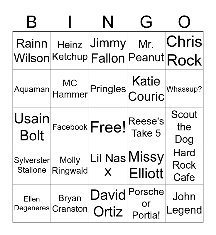 This bingo card has a free space and 29 words: Ellen Degeneres, Donald Trump, Facebook, Michael Bloomberg, Rainn Wilson, Jimmy Fallon, MC Hammer, Molly Ringwald, Reese's Take 5, Bryan Cranston, Scout the Dog, John Legend, David Ortiz, Porsche or Portia!, Whassup?, Katie Sowers, Lil Nas X, Sylverster Stallone, Chris Rock, Usain Bolt, Missy Elliott, Bill Nye the Science Guy, Katie Couric, Aquaman, Mr. Peanut, Heinz Ketchup, Hard Rock Cafe, Pringles and John Krasinksi.
