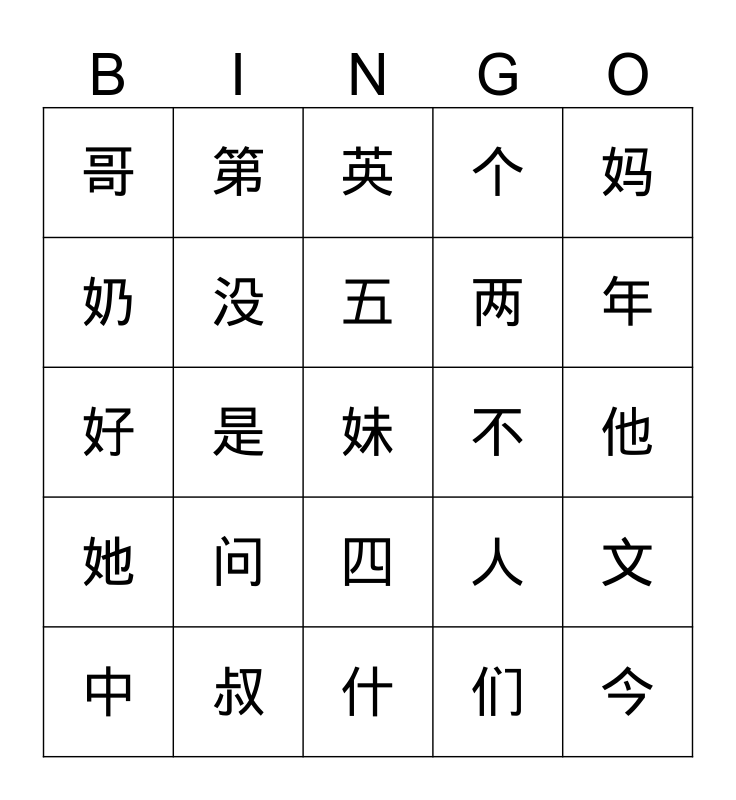 This bingo card has 60 words: 姑, 叔, 的, 她, 们, 叫, 没, 有, 两, 家, 个, 舅, 奶, 爷, 弟, 哥, 妹, 妈, 姐, 五, 不, 英, 中, 文, 名, 字, 生, 日, 年, 月, 天, 号, 星, 期, 第, 妈, 爸, 是, 你, 好, 请, 问, 他, 我, 人, 八, 九, 七, 六, 四, 什, 么, 谁, 伯, 姨, 姥, 口, 明, 今 and 零.