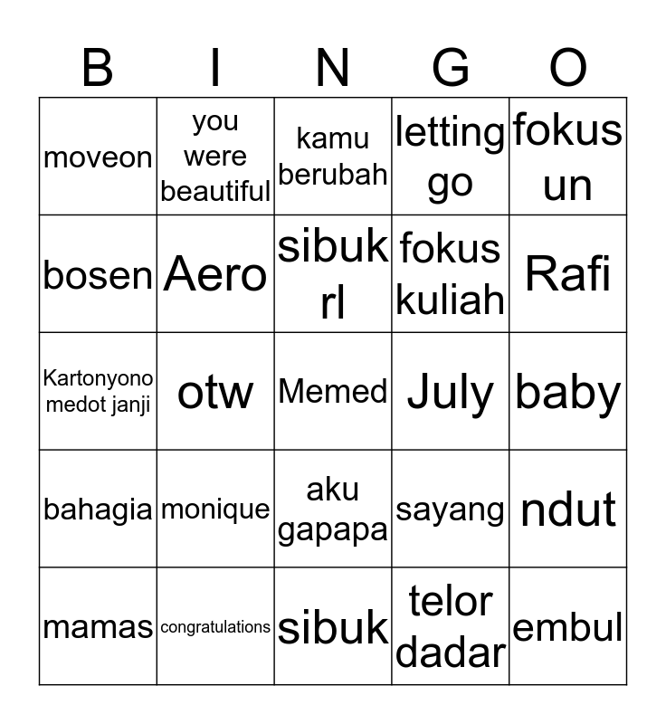 This bingo card has a free space and 24 words: monique, congratulations, sibuk rl, mamas, fokus un, moveon, bosen, you were beautiful, July, aku gapapa, fokus kuliah, Kartonyono medot janji, sayang, ndut, Aero, telor dadar, baby, kamu berubah, Rafi, otw, embul, bahagia, letting go and sibuk.
