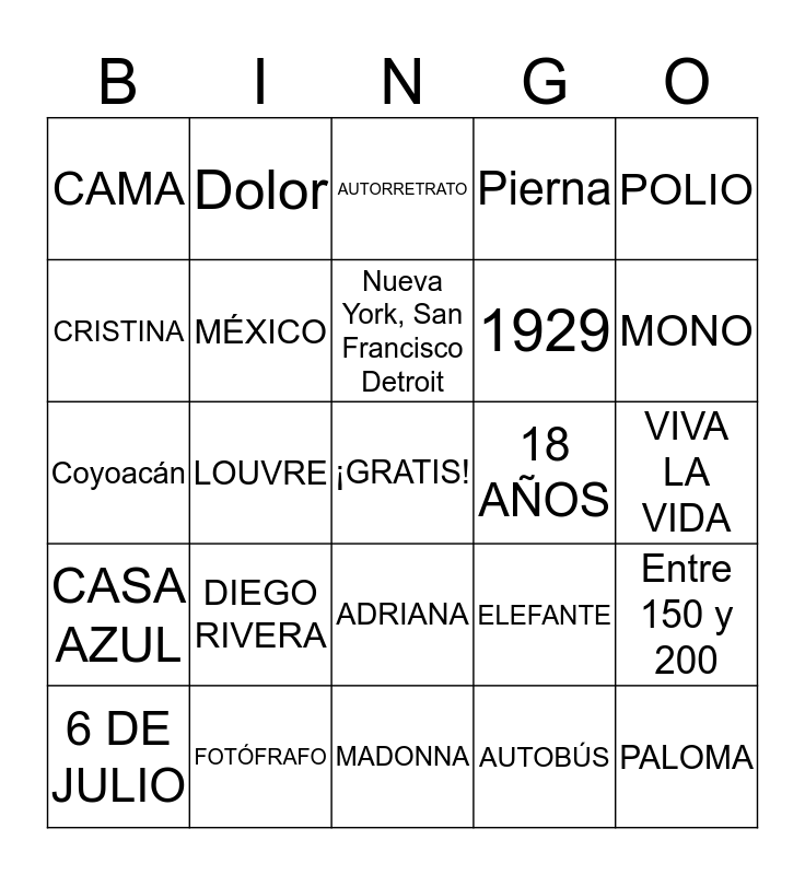 This bingo card has a free space and 29 words: 6 DE JULIO, 1907, LOUVRE, MATILDE, CAMA, AUTORRETRATO, MÉXICO, DIEGO RIVERA, 18 AÑOS, FOTÓFRAFO, VIVA LA VIDA, PALOMA, MADONNA, AUTOBÚS, MONO, 1954, ADRIANA, CASA AZUL, POLIO, Coyoacán, ELEFANTE, Guillermo, 1929, CRISTINA, Pierna, Dolor, Entre 150 y 200, Nueva York, San Francisco Detroit and Brillantes.