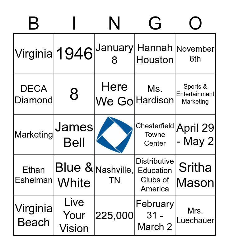 This bingo card has a free space and 24 words: Blue & White, Live Your Vision, Here We Go, Virginia Beach, November 6th, Virginia, DECA Diamond, 1946, Chesterfield Towne Center, Nashville, TN, Ms. Hardison, Marketing, Distributive Education Clubs of America, Sritha Mason, 8, February 31 - March 2, April 29 - May 2, January 8, Sports & Entertainment Marketing, James Bell, Mrs. Luechauer, Ethan Eshelman, Hannah Houston and 225,000.