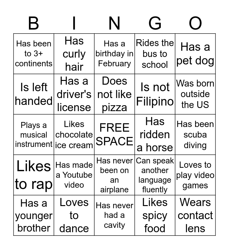 This bingo card has a free space and 24 words: Has made a Youtube video, Loves to dance, Does not like pizza, Has a younger brother, Has a pet dog, Has been to 3+ continents, Is left handed, Has curly hair, Has ridden a horse, Has never been on an airplane, Is not Filipino, Plays a musical instrument, Can speak another language fluently, Loves to play video games, Has a driver's license, Likes spicy food, Has been scuba diving, Has a birthday in February, Was born outside the US, Likes chocolate ice cream, Wears contact lens, Likes to rap, Rides the bus to school and Has never had a cavity.