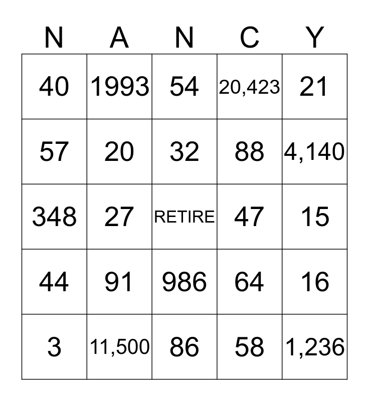 This bingo card has a free space and 24 words: 3, 91, 32, 58, 21, 40, 1993, 54, 47, 15, 348, 20, 64, 16, 57, 11,500, 86, 20,423, 4,140, 44, 27, 986, 88 and 1,236.