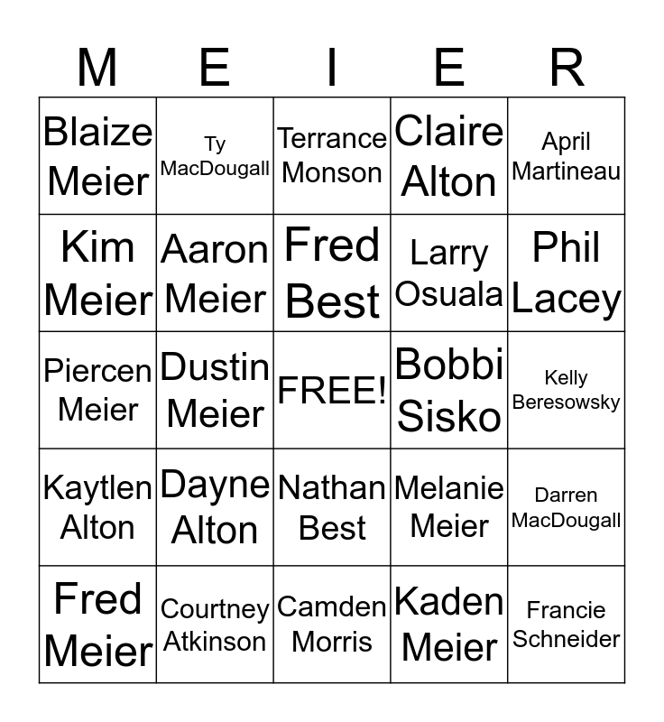 This bingo card has a free space and 65 words: Sam Wagner, Wayne Wagner, Nadine MacDougall, Darren MacDougall, Camden MacDougall, Reece MacDougall, Ty MacDougall, Tasha Best, Fred Best, Samantha Best, Nathan Best, Jessie Beresowsky, Kelly Beresowsky, April Martineau, Kelly Meier, Kim Meier, Dustin Meier, Blaize Meier, Tracie Osuala, Larry Osuala, Dayne Alton, Kaytlen Alton, Claire Alton, Liam Alton, Brittney Alton, Stephie Osuala, Alexis Osuala, Brooklyn Osuala, Francie Schneider, Walter Schneider, Fred Meier, Mildred Meier, Terry Meier, Lynn Meier, Melanie Meier, Courtney Atkinson, Darcy Meier, Piercen Meier, Kaden Meier, Brennan Meier, Aaron Meier, Wendy Verpy, Bobbi Sisko, David Sisko, Tyler Sisko, Brandi Verpy, Phil Lacey, Oasis Lacey, Stuart Lacey, Lori Morris, Jim Morris, James Morris, Kristy Morris, Camden Morris, Alyssa Morris, Kassandra Eckert, Torin Monson, Terrance Monson, Jason Eckert, Shirley Meier, Lawrence Meier, Gladys Johnson, Everett (Bus) Johnson, Frederick Meier and Bertha Meier.