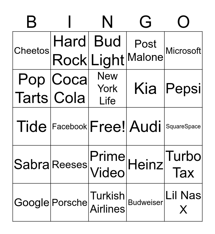 This bingo card has a free space and 43 words: Doritos, Lil Nas X, Military Service Person, Google, Alexa, Budweiser, Bud Light, Hyundai, Microsoft, Porsche, Post Malone, Audi, Prime Video, Reeses, Michelob Ultra, Turkish Airlines, Quicken Loans, Tide, Little Caesars, Pepsi, Hard Rock, Planters Peanuts, Verizon, Cheetos, Mountain Dew, SquareSpace, Bloomberg, Donald Trump, Heinz, Sabra, Olay, Turbo Tax, ADT, Facebook, Toyota, Snickers, Pringles, New York Life, Pop Tarts, Kia, Avocados From Mexico, Coca Cola and WeatherTech.