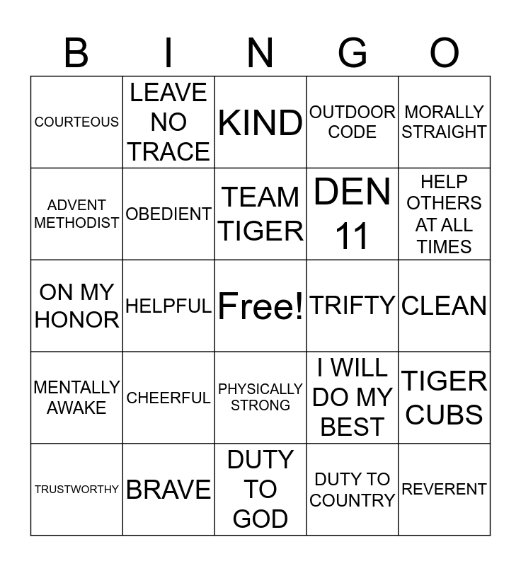 This bingo card has a free space and 29 words: TRUSTWORTHY, LOYAL, HELPFUL, FRIENDLY, COURTEOUS, KIND, OBEDIENT, CHEERFUL, TRIFTY, BRAVE, CLEAN, REVERENT, DUTY TO GOD, DUTY TO COUNTRY, HELP OTHERS AT ALL TIMES, OBEY THE SCOUT LAW, PHYSICALLY STRONG, MENTALLY AWAKE, MORALLY STRAIGHT, ON MY HONOR, I WILL DO MY BEST, PACK 833, DEN 11, ADVENT METHODIST, OUTDOOR CODE, LEAVE NO TRACE, TIGER CUBS, TEAM TIGER and SERVE MY COMMUNITY.