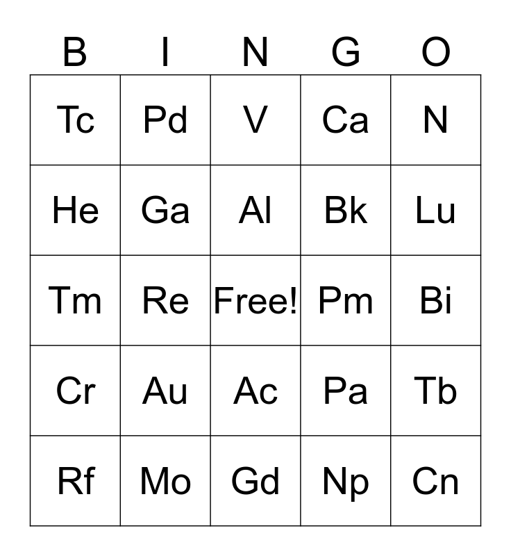 This bingo card has a free space and 112 words: H, Li, Be, Na, Mg, K, Ca, Rb, Sr, Cs, Ba, Fr, Ra, Sc, Y, La, Ac, Ti, Zr, Hf, Rf, V, Nb, Ta, Db, Cr, Mo, W, Sg, Mn, Tc, Re, Bh, Fe, Ru, Os, Hs, Co, Rh, Ir, Mt, Ce, Pr, Nd, Pm, Sm, Eu, Gd, Th, Pa, U, Np, Pu, Am, Cm, Ni, Pd, Pt, Ds, Tb, Bk, Dy, Cf, Ho, Es, Er, Fm, Tm, Md, Yb, No, Lu, Lr, Cu, Ag, Au, Rg, Zn, Cd, Hg, Cn, B, Al, Ga, In, Tl, C, Si, Ge, Sn, Pb, N, P, As, Sb, Bi, O, S, Se, Te, Po, F, Cl, Br, I, At, He, Ne, Ar, Kr, Xe and Rn.