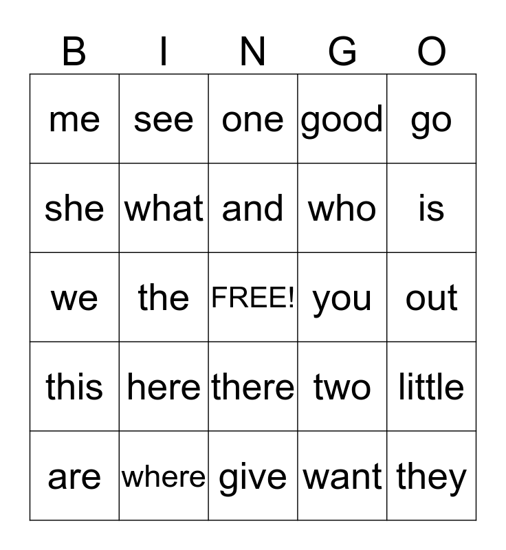 This bingo card has a free space and 24 words: here, where, and, are, go, me, she, see, you, there, who, we, two, little, what, want, out, one, is, the, they, this, good and give.
