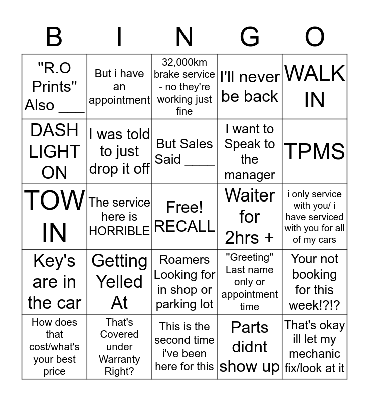 This bingo card has a free space and 24 words: Getting Yelled At, That's Covered under Warranty Right?, But Sales Said ____, How does that cost/what's your best price, WALK IN, ''R.O Prints'' Also ___, DASH LIGHT ON, But i have an appointment, Waiter for 2hrs +, Roamers Looking for in shop or parking lot, I want to Speak to the manager, TOW IN, ''Greeting'' Last name only or appointment time, Your not booking for this week!?!?, I was told to just drop it off, Parts didnt show up, i only service with you/ i have serviced with you for all of my cars, 32,000km brake service - no they're working just fine, TPMS, The service here is HORRIBLE, That's okay ill let my mechanic fix/look at it, Key's are in the car, I'll never be back and This is the second time i've been here for this.