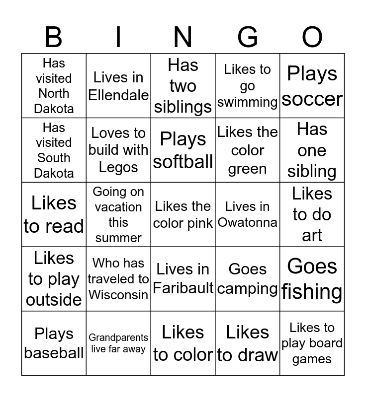 This bingo card has a free space and 24 words: Who has traveled to Wisconsin, Grandparents live far away, Plays softball, Plays baseball, Plays soccer, Has visited North Dakota, Has visited South Dakota, Lives in Ellendale, Lives in Owatonna, Lives in Faribault, Likes the color green, Likes to read, Goes camping, Goes fishing, Loves to build with Legos, Likes to draw, Likes to do art, Has two siblings, Has one sibling, Going on vacation this summer, Likes to play board games, Likes to play outside, Likes to go swimming and Likes to color.