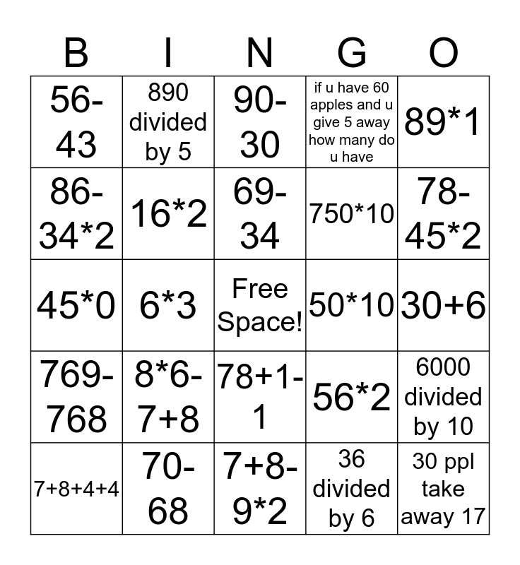 This bingo card has a free space and 29 words: 7+8+4+4, 2*4, 6*3, 2*4-6, 56-43, 90-30, 16*2, 8*6-7+8, 50*10, 70-68, 30+6, 30 ppl take away 17, 7+8-9*2, 36 divided by 6, 78-45*2, 45-1, 78+1-1, 769-768, 89*1, 45*0, 56*2, u have 10 marbles u give away 2 and then get 8 more marbels how many do u have, 750*10, 86-34*2, if u have 60 apples and u give 5 away how many do u have, 890 divided by 5, 6000 divided by 10, 69-34 and 70*10.