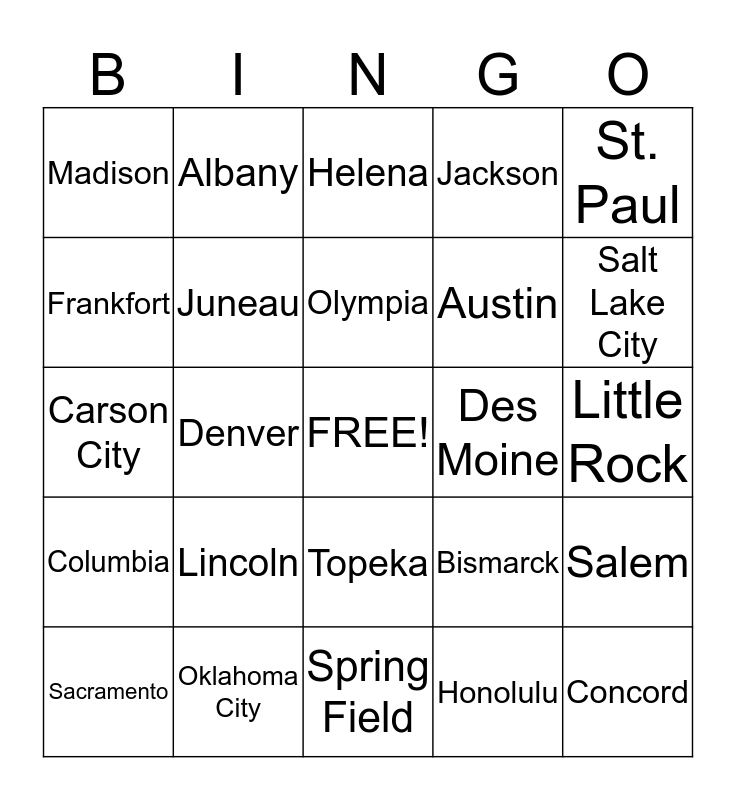 This bingo card has a free space and 24 words: Lincoln, Oklahoma City, Olympia, Sacramento, St. Paul, Madison, Frankfort, Albany, Des Moine, Topeka, Austin, Carson City, Bismarck, Salem, Juneau, Honolulu, Little Rock, Helena, Salt Lake City, Denver, Concord, Columbia, Jackson and Spring Field.