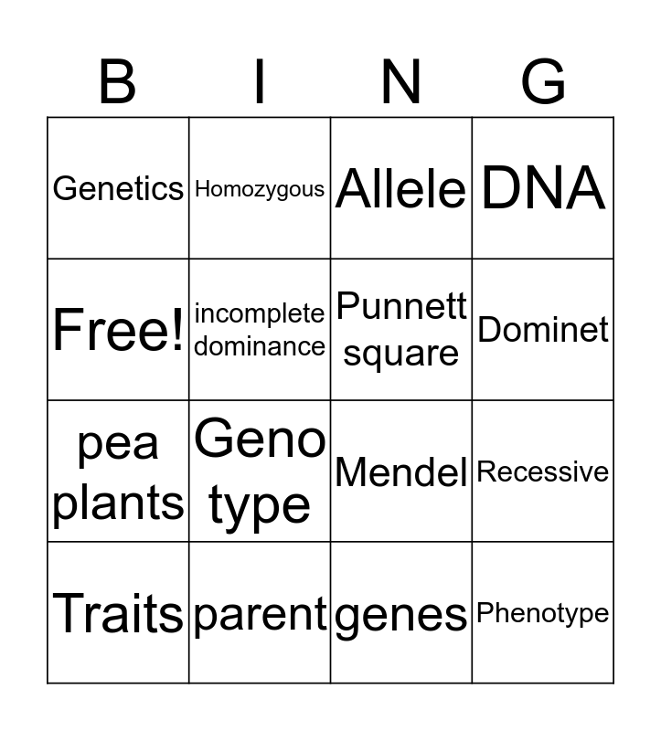 This bingo card has 16 words: parent, Recessive, Allele, Genetics, pea plants, Homozygous, Mendel, genes, Free!, incomplete dominance, Traits, DNA, Geno type, Dominet, Punnett square and Phenotype.