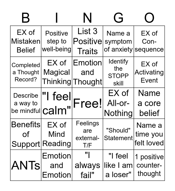 This bingo card has a free space and 24 words: ANTs, EX of Mind Reading, Emotion and Thought, "I feel like I am a loser", EX of Con-sequence, EX of Mistaken Belief, Positive step to well-being, List 3 Positive Traits, EX of All-or-Nothing, Name a core belief, Describe a way to be mindful, EX of Magical Thinking, "Should" Statement, Name a time you felt loved, Completed a Thought Record?, Emotion and Emotion, "I always fail", Name a symptom of anxiety, EX of Activating Event, Benefits of Support, "I feel calm", Feelings are external- T/F, Identify the STOPP skill and 1 positive counter-thought.