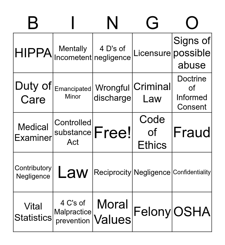 This bingo card has a free space and 38 words: Assault, Battery, Bioethics, Code of Ethics, Confidentiality, Contributory Negligence, Controlled substance Act, Coroner, Criminal Law, Doctrine of Informed Consent, Duty of Care, Emancipated Minor, Felony, Fraud, HIPPA, Law, Liable, Licensure, Litigious, Medical Examiner, Mentally Incometent, Moral Values, Negligence, OSHA, PHI, Protocol, Reciprocity, Respondeat Superior, Standard of care, Statute of Limitations, Unborn Victims of Violence Act, Wrongful discharge, Bloodborne pathogen standards, Signs of possible abuse, Vital Statistics, 4 C's of Malpractice prevention, 4 D's of negligence and Good Samaritan Act.