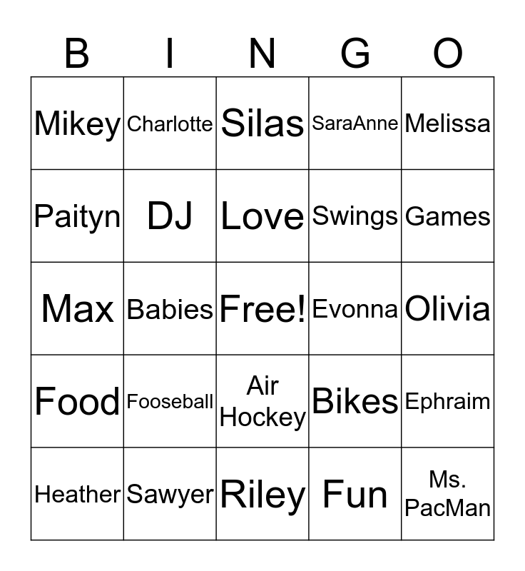 This bingo card has a free space and 24 words: Fooseball, Sawyer, Love, Heather, Melissa, Mikey, Paityn, Charlotte, Evonna, Air Hockey, Swings, Max, Bikes, Ephraim, DJ, Fun, Olivia, Silas, Games, Babies, Ms. PacMan, Food, SaraAnne and Riley.