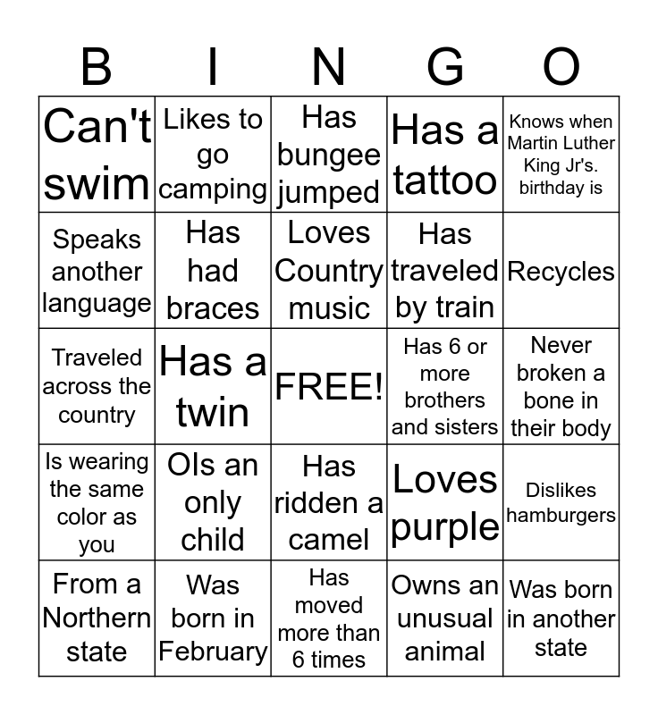 This bingo card has a free space and 24 words: OIs an only child, Was born in February, Loves Country music, From a Northern state, Knows when Martin Luther King Jr's. birthday is, Can't swim, Speaks another language, Likes to go camping, Has 6 or more brothers and sisters, Has ridden a camel, Has traveled by train, Traveled across the country, Loves purple, Dislikes hamburgers, Has had braces, Owns an unusual animal, Never broken a bone in their body, Has bungee jumped, Recycles, Has a twin, Was born in another state, Is wearing the same color as you, Has a tattoo and Has moved more than 6 times.