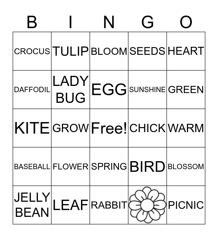 This bingo card has 1 images, a free space and 24 words: FLOWER, RABBIT, EGG, JELLY BEAN, HEART, CROCUS, DAFFODIL, TULIP, CHICK, SPRING, SUNSHINE, KITE, BIRD, BLOSSOM, LADY BUG, SHOWERS, WARM, BLOOM, GREEN, GROW, PICNIC, LEAF, BASEBALL and SEEDS.