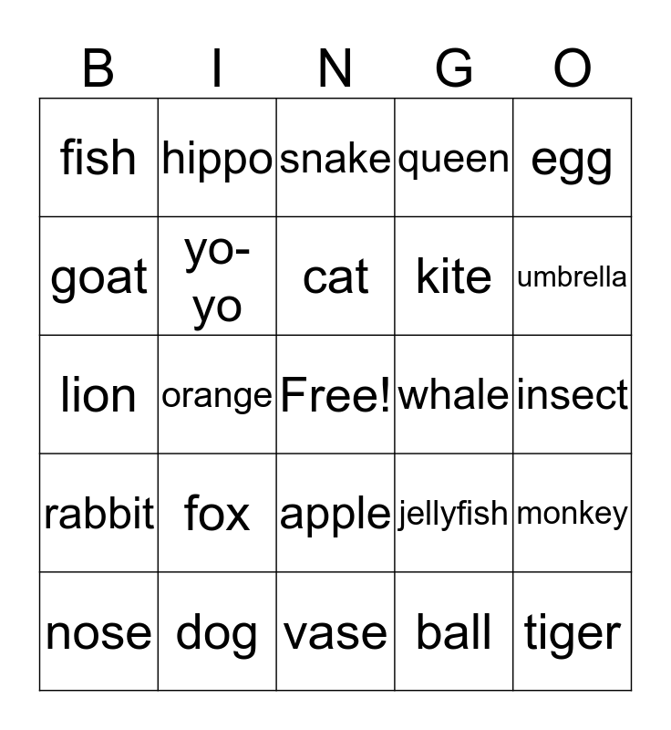 This bingo card has a free space and 26 words: apple, ball, cat, dog, egg, fish, goat, hippo, insect, jellyfish, kite, lion, monkey, nose, orange, pig, queen, rabbit, snake, tiger, umbrella, vase, whale, fox, yo-yo and zebra.