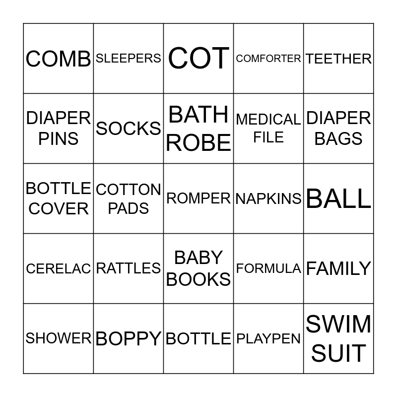 This bingo card has 90 words: ACTIVITY WALKER, RUBBER DUCKS, BABY BOOKS, BABY CREAM, BABY LIQUID CLEANSER, BABY LOTION, MOTHERHOOD, BABY POWDER, BABY SHAMPOO, BABY SOAP, BABY SWING, CUDDLE, BABY WIPES, BALL, NURSURY, BATH ROBE, BATH TUB, BATHER, BIB, BLANKET, BODYWASH, BOOTIES, BOTTLE, BOTTLE CLEANSER, BOTTLE COVER, BOPPY, BOTTLE WARMER, BOUNCY SEAT, BOY, BREAST PUMP, BULB SYRINGE, FAMILY, CAPS, CERELAC, COMB, COMFORTER, COT, CRIB SHEETS, COTTON PADS, DIAPER BAGS, SHOWER, DIAPER PINS, DRESSER, DIAPER, FEEDING SPOON, FORMULA, FRONT CARRIER, GIRL, HAMPER, HIGH CHAIR, INFANT CAR SEAT, MEDICAL FILE, MEDICINES, MILK STORAGE CONTAINERS, MITTENS, NAIL CUTTER, NAPKINS, NAPPY, NAPPY CREAM, NIGHT SUIT, NURSING PILLOWS, OIL, STORK, PACIFIER, PETROLEUM JELLY, PLAY GYM, PLAY MAT, PLAYPEN, POWDER MILK, PRAM, RATTLES, ROMPER, SHOES, SIPPER, SLEEPERS, SOCKS, SOFT TOYS, SOOTHER, STERILIZER, STROLLER, SWIM SUIT, TEETHER, THERMOMETER, TIFFIN BOX, TOOTHBRUSH, TOOTHPASTE, TOWELS, TOYS, WATERPROOF LINERS and WOOLENS.