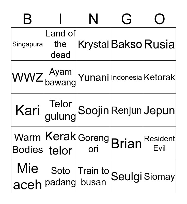 This bingo card has a free space and 24 words: Kerak telor, Soto padang, Yunani, Mie aceh, Rusia, Singapura, WWZ, Land of the dead, Renjun, Goreng ori, Indonesia, Kari, Brian, Resident Evil, Ayam bawang, Seulgi, Jepun, Krystal, Ketorak, Telor gulung, Siomay, Warm Bodies, Bakso and Train to busan.