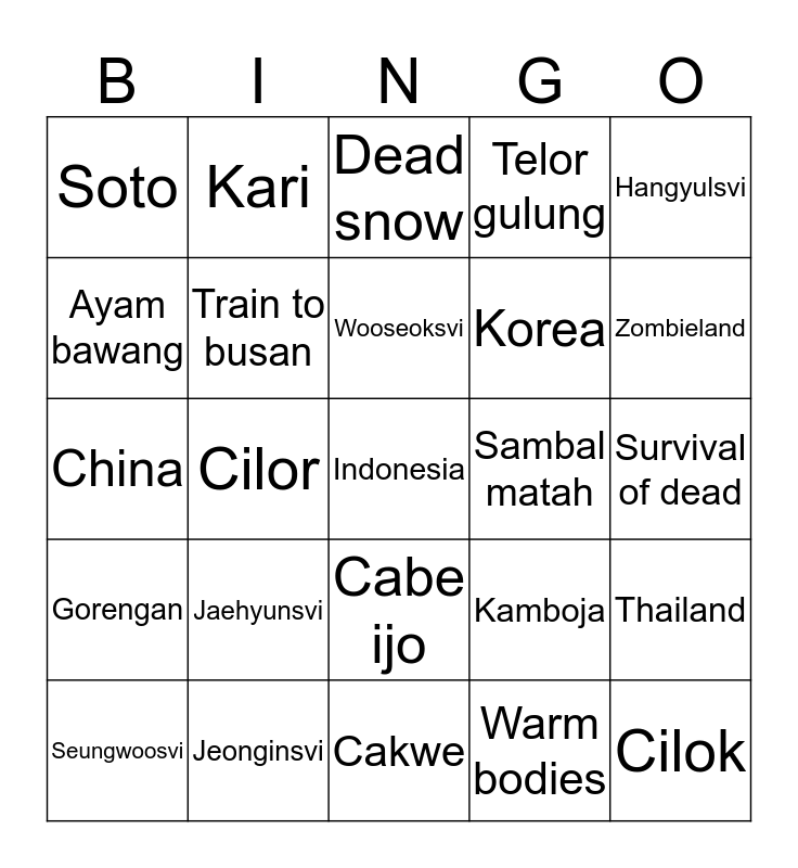 This bingo card has a free space and 24 words: Jaehyunsvi, Jeonginsvi, Wooseoksvi, Seungwoosvi, Hangyulsvi, Soto, Ayam bawang, Kari, Sambal matah, Cabe ijo, Korea, China, Kamboja, Thailand, Train to busan, Warm bodies, Survival of dead, Dead snow, Zombieland, Cilor, Cilok, Gorengan, Telor gulung and Cakwe.