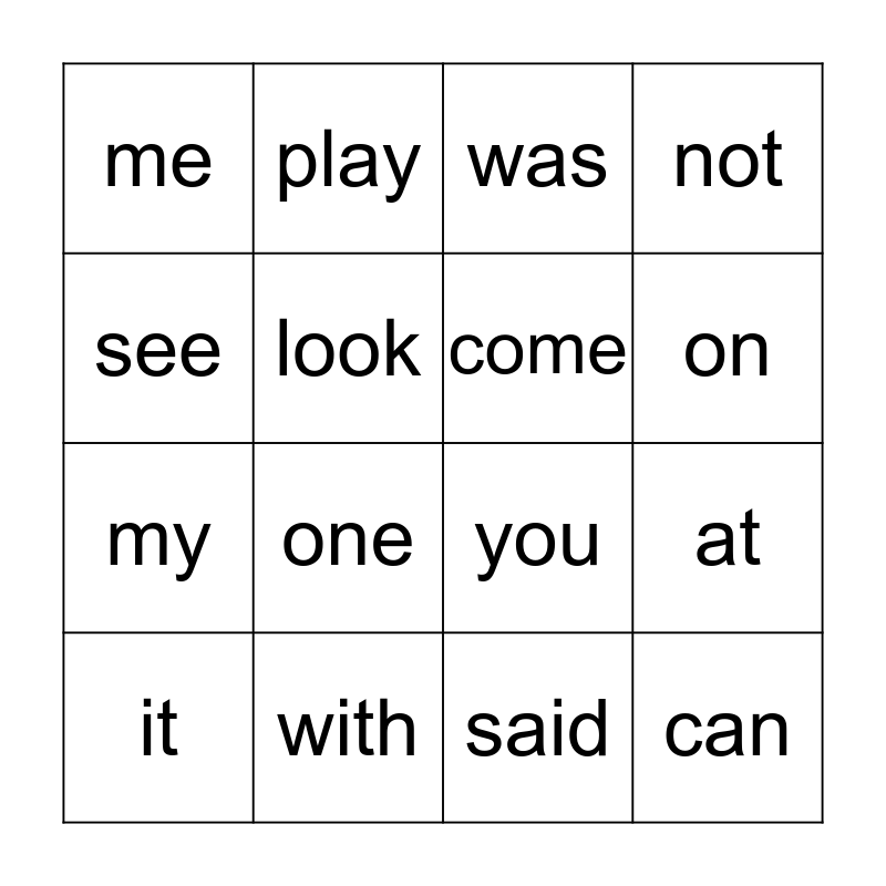 This bingo card has 16 words: with, at, was, me, my, play, you, said, see, look, it, not, one, on, come and can.