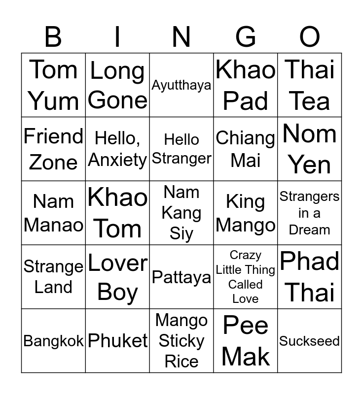 This bingo card has 25 words: Lover Boy, Mango Sticky Rice, Hello Stranger, Bangkok, Thai Tea, Tom Yum, Friend Zone, Long Gone, King Mango, Pattaya, Chiang Mai, Nam Manao, Crazy Little Thing Called Love, Phad Thai, Hello, Anxiety, Suckseed, Strangers in a Dream, Ayutthaya, Nom Yen, Khao Tom, Nam Kang Siy, Phuket, Strange Land, Khao Pad and Pee Mak.
