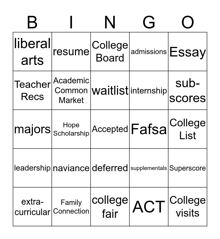 This bingo card has a free space and 24 words: naviance, Family Connection, waitlist, extra-curricular, Essay, liberal arts, Teacher Recs, resume, Fafsa, deferred, internship, majors, supplementals, Superscore, Academic Common Market, ACT, College List, College Board, sub-scores, Hope Scholarship, College visits, leadership, admissions and college fair.