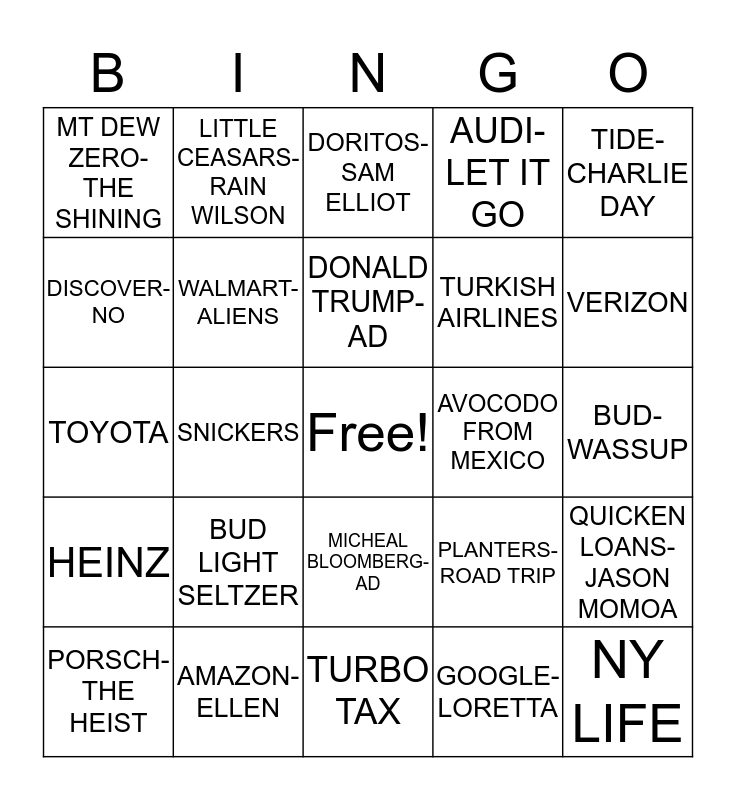 This bingo card has a free space and 44 words: HYUNDI-SMART PAWK, NY LIFE, BUD-TYPICAL AMERICANS, PORSCH-THE HEIST, MICROSOFT-1ST WOMAN COACH, GOOGLE-LORETTA, DORITOS-SAM ELLIOT, CHEETOS-MC HAMMER, TIDE-CHARLIE DAY, AMAZON-ELLEN, AUDI- LET IT GO, AVOCODO FROM MEXICO, MICHEAL BLOOMBERG-AD, BUD LIGHT SELTZER, OLAY-NASA, TURBO TAX, FACEBOOK-CHRIS ROCK, TOYOTA, POPTART, VERIZON, LITTLE CEASARS-RAIN WILSON, ULTRA-JIMMY FALLON, ULTRA PURE GOLD-6PK, MT DEW ZERO-THE SHINING, NFL INSPIRE CHANGE, BUD-WASSUP, COKE-AHA, PEPSI ZERO-MISSY ELLIOT, PLANTERS-ROAD TRIP, HEINZ, PRINGLES-RICK AND MORTY, QUICKEN LOANS-JASON MOMOA, REESES-TAKE 5, SABRA HUMUS, SNICKERS, SODA STREAM-BILL NYE, SQUARE SPACE-WINNONA RYDER, HARD ROCK INTN'L, DONALD TRUMP-AD, DISCOVER-NO, TURKISH AIRLINES, KIA-JOSH JACOBS, WALMART-ALIENS and WEATHER TECH.