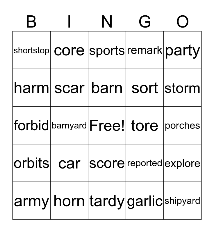 This bingo card has a free space and 24 words: car, horn, barn, army, party, shortstop, harm, core, tore, score, sort, forbid, reported, explore, scar, garlic, porches, sports, storm, barnyard, shipyard, orbits, remark and tardy.