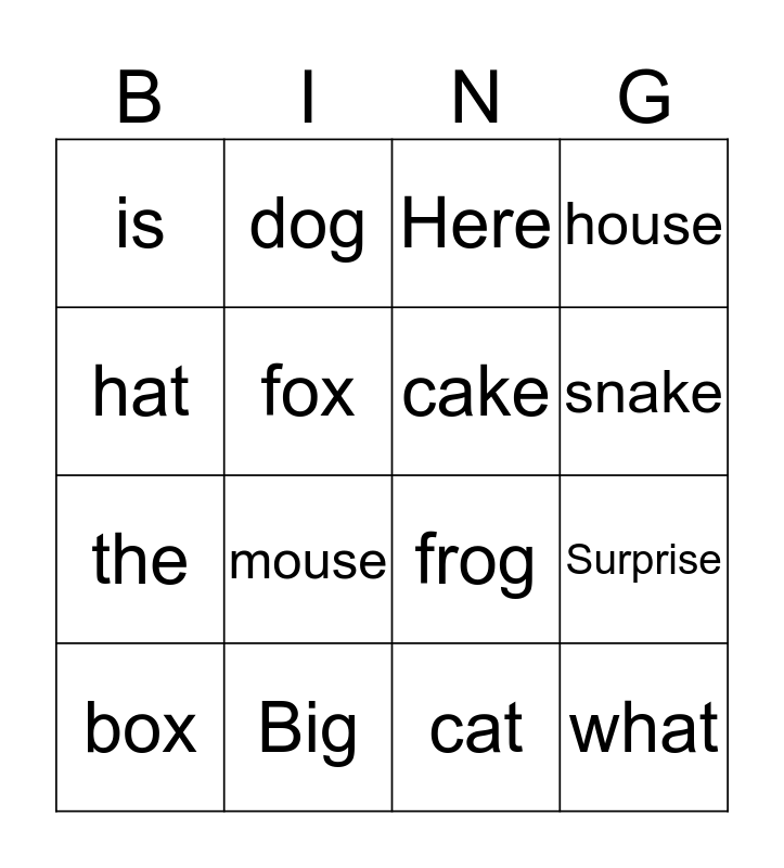 This bingo card has 16 words: Big, Surprise, Here, is, the, dog, frog, cat, hat, fox, box, house, mouse, snake, cake and what.