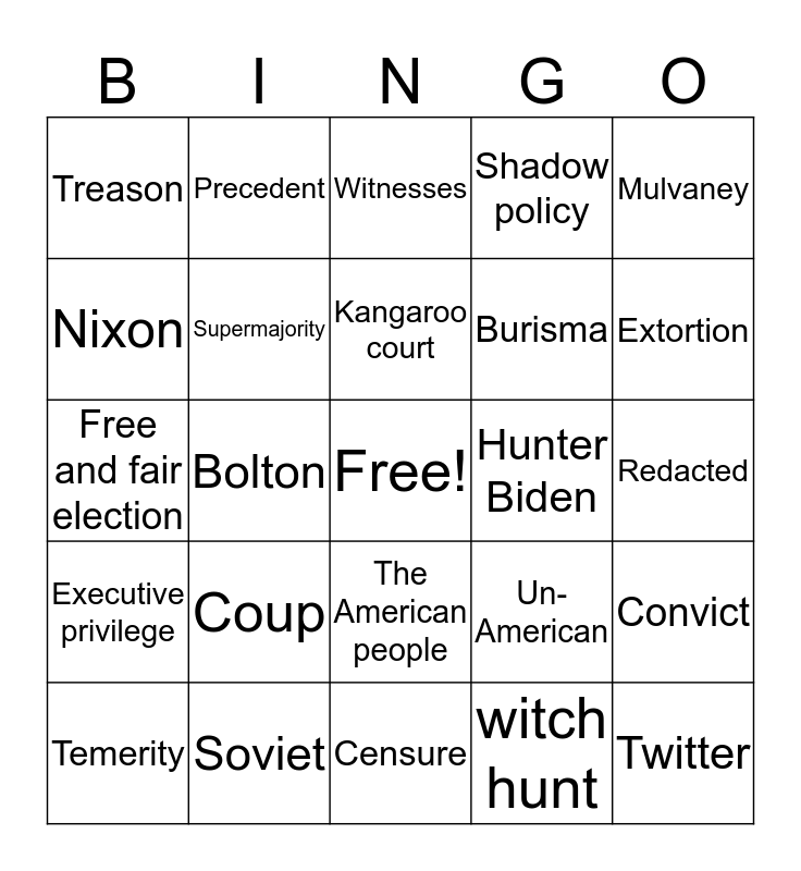 This bingo card has a free space and 56 words: Pettifogger, Temerity, Dilatory, Treason, Censure, Quid pro quo, Supermajority, Arrogate, Burisma, Extortion, Shadow policy, Hand grenade, Whistleblower, Ukraine, Transcript, "Sole power", Mulvaney, Bolton, Joe Biden, Twitter, Hunter Biden, Dictator, Un-American, Witnesses, Milk, Kangaroo court, High crimes and misdemeanors, Dirt, Extortion, Ukraine, Abuse of power, "Shred of evidence", Constitutiuonal, Unconstitutional, Redacted, Nixon, Free and fair election, Prior restraint, Executive privilege, Precedent, The American people, Coequal, Jefferson, Madison, Verdict, Coup, Soviet, Putin, show-trial, circus, witch hunt, Duffy, Blair, The Framers, Convict and Acquit.