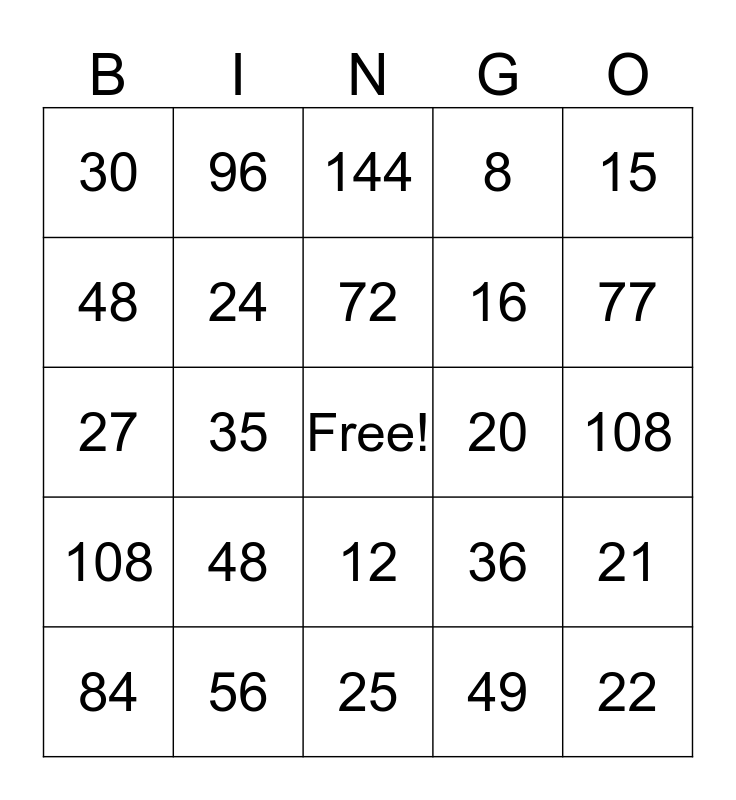 This bingo card has a free space and 24 words: 48, 56, 72, 84, 15, 30, 48, 96, 20, 12, 16, 27, 36, 21, 24, 49, 108, 144, 77, 35, 22, 108, 8 and 25.