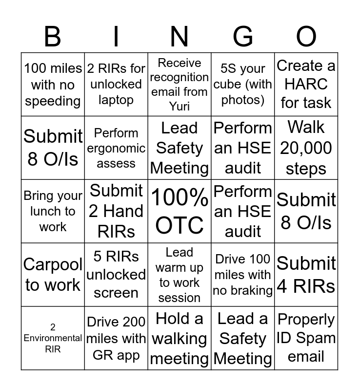 This bingo card has a free space and 24 words: 5 RIRs unlocked screen, Drive 200 miles with GR app, Lead Safety Meeting, 2 Environmental RIR, Create a HARC for task, 100 miles with no speeding, Submit 8 O/Is, 2 RIRs for unlocked laptop, Perform an HSE audit, Lead warm up to work session, Perform an HSE audit, Bring your lunch to work, Drive 100 miles with no braking, Submit 4 RIRs, Perform ergonomic assess, Lead a Safety Meeting, Submit 8 O/Is, Receive recognition email from Yuri, Walk 20,000 steps, Submit 2 Hand RIRs, Properly ID Spam email, Carpool to work, 5S your cube (with photos) and Hold a walking meeting.