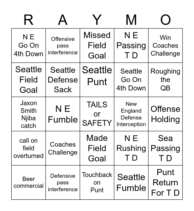 This bingo card has 50 words: HEADS or SAFETY, TAILS or SAFETY, runs it out of endzone on Kickoff, Touchback on Punt, Coaches Challenge, Offside Penalty accepted, Offensive pass interference, N E Field goal, Seattle Field Goal, New England Defense Sack, Seattle Defense Sack, N E Passing T D, Sea Passing T D, N E Rushing T D, Seattle Rushing T D, N E Punt, Seattle Punt, New England Defense Interception, Seattle Defense Interception, Win Coaches Challenge, N E Fumble, Seattle Fumble, N E Go On 4th Down, Seattle Go On 4th Down, Kickoff Return For T D, Punt Return For T D, Roughing the QB, Darnold Pass Completion, Missed Field Goal, Made Field Goal, 2 Point Attempt, Hunter Henry Catch, A J Barner Catch, Defense Holding, Defensive pass interference, Personal foul, Seattle Time Out, N E Time Out, 50 yard + FG attempt, Offense Holding, Hands to the face, Intentional Grounding on QB, Block in the back, Personal Foul, Beer commercial, Jaxon Smith Njiba catch, N E offense holding, Seattle offensive holding, call on field overturned and 2 minute warning.