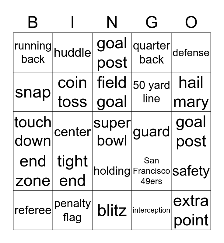 This bingo card has 40 words: safety, touch down, tackle, coin toss, penalty flag, holding, field goal, offense, defense, end zone, center, quarter back, super bowl, goal post, guard, tight end, wide receiver, running back, football, goal post, safety, interception, 50 yard line, snap, pass, punt, kicker, sack, extra point, face mask, head coach, referee, Kansas City Chiefs, San Francisco 49ers, hail mary, blitz, flea flicker, helmet, huddle and red zone.