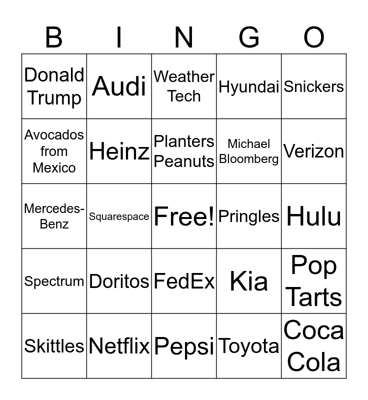This bingo card has a free space and 50 words: Geico, Coca Cola, Chevrolet, Pepsi, Doritos, Mountain Dew, Audi, Cheetos, Avocados from Mexico, Facebook, Heinz, Hyundai, Pop Tarts, Kia, New York Life Insurance, Olay, Planters Peanuts, Pringles, Sabra Hummus, Snickers, Squarespace, Toyota, Donald Trump, Michael Bloomberg, Turbo Tax, Turkish Airlines, Verizon, AT&T, Weather Tech, FedEx, Tide, M&M's, Amazon, Hard Rock Café, Netflix, Google, T-Mobile, McDonald's, Walmart, Hulu, Skittles, Bud Light, Sketchers, Pizza Hut, Skittles, Mercedes-Benz, Microsoft, Optimum, Spectrum and State Farm.
