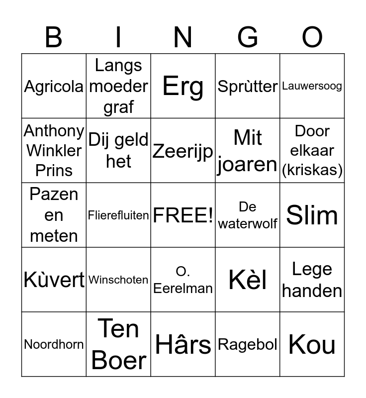 This bingo card has a free space and 24 words: Winschoten, Ten Boer, Zeerijp, Noordhorn, Lauwersoog, Agricola, Anthony Winkler Prins, Langs moeder graf, De waterwolf, O. Eerelman, Mit joaren, Pazen en meten, Kèl, Lege handen, Dij geld het, Ragebol, Slim, Erg, Door elkaar (kriskas), Flierefluiten, Kou, Kùvert, Sprùtter and Hârs.