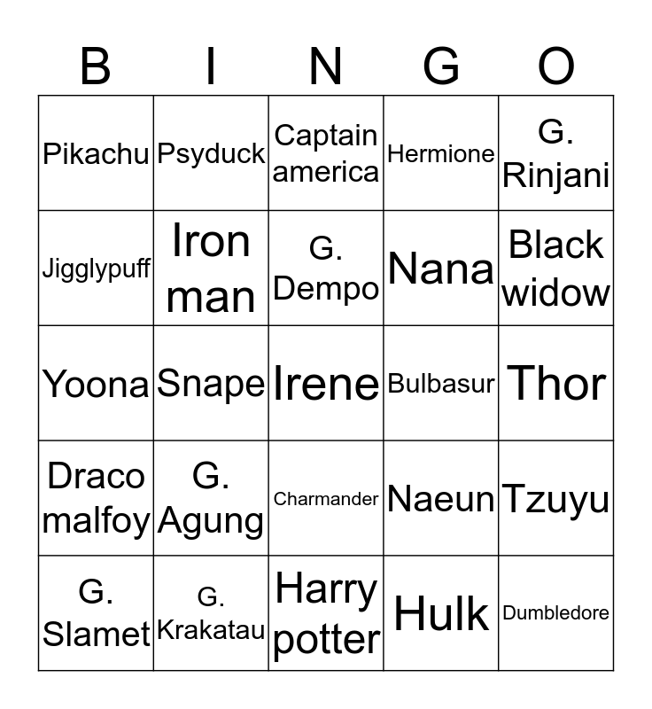 This bingo card has a free space and 24 words: G. Agung, G. Krakatau, G. Dempo, G. Slamet, G. Rinjani, Pikachu, Jigglypuff, Psyduck, Bulbasur, Charmander, Nana, Yoona, Naeun, Tzuyu, Iron man, Hulk, Thor, Captain america, Black widow, Snape, Dumbledore, Draco malfoy, Hermione and Harry potter.