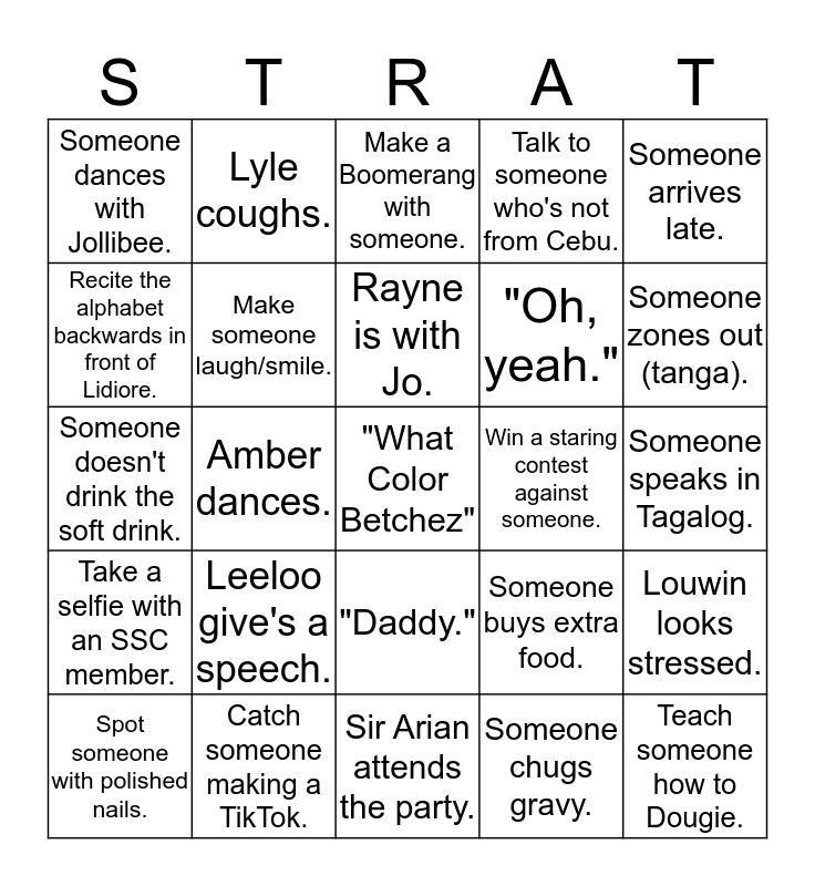 This bingo card has 25 words: Leeloo give's a speech., Sir Arian attends the party., Rayne is with Jo., Spot someone with polished nails., Someone arrives late., Someone dances with Jollibee., Recite the alphabet backwards in front of Lidiore., Lyle coughs., Win a staring contest against someone., "Daddy.", "Oh, yeah.", Someone doesn't drink the soft drink., Someone buys extra food., Louwin looks stressed., Make someone laugh/smile., Teach someone how to Dougie., Someone speaks in Tagalog., Make a Boomerang with someone., Someone zones out (tanga)., Amber dances., "What Color Betchez", Catch someone making a TikTok., Take a selfie with an SSC member., Talk to someone who's not from Cebu. and Someone chugs gravy..